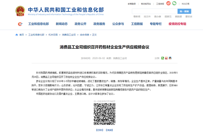 | 工信部消費(fèi)品工業(yè)司組織召開(kāi)藥包材企業(yè)生產(chǎn)供應(yīng)視頻會(huì)議 |
